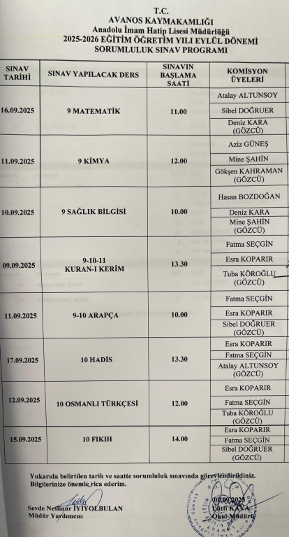 EYLÜL DÖNEMİ SORUMLULUK TAKVİMİ